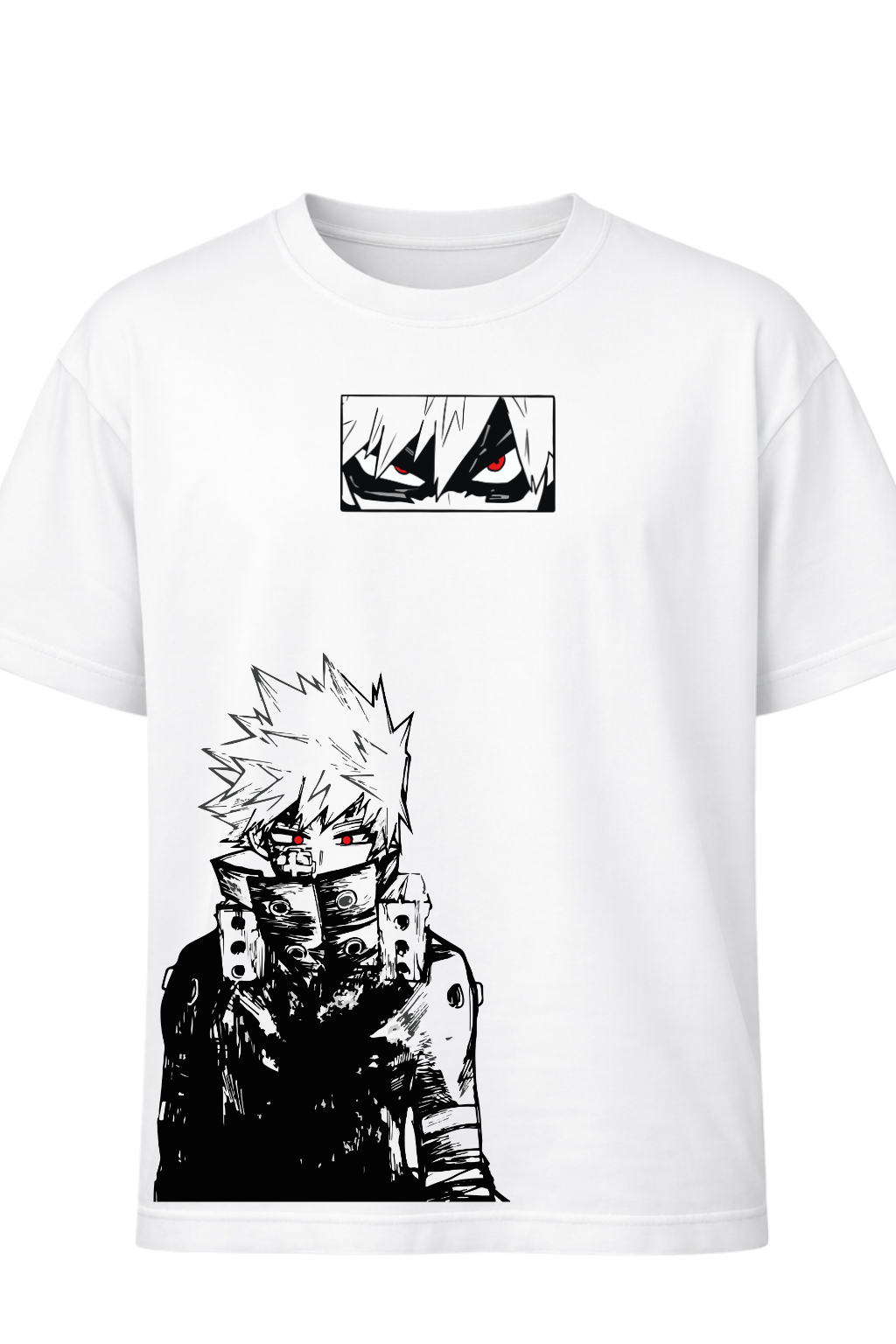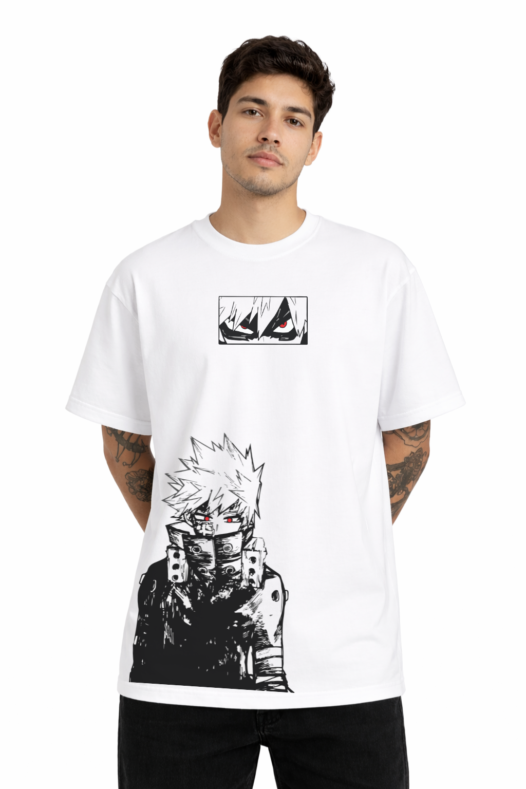 Playera blanca inspirada en Katsuki Bakugo de My Hero Academia, con corte semi oversize y tela de algodón premium. Cómoda, resistente y perfecta para fans del anime. Ideal para uso diario o como regalo otaku.