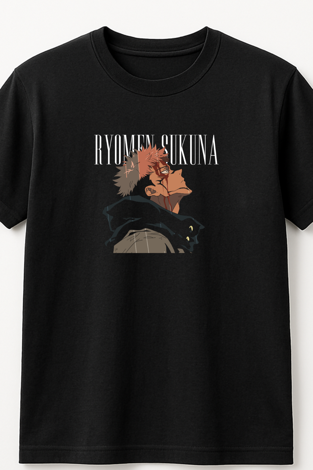 Playera de Ryomen Sukuna inspirada en Jujutsu Kaisen, con diseño tipo manga y tipografía japonesa en contraste sobre base negra. Confeccionada en algodón suave y resistente, ideal para fans del anime y el streetwear.